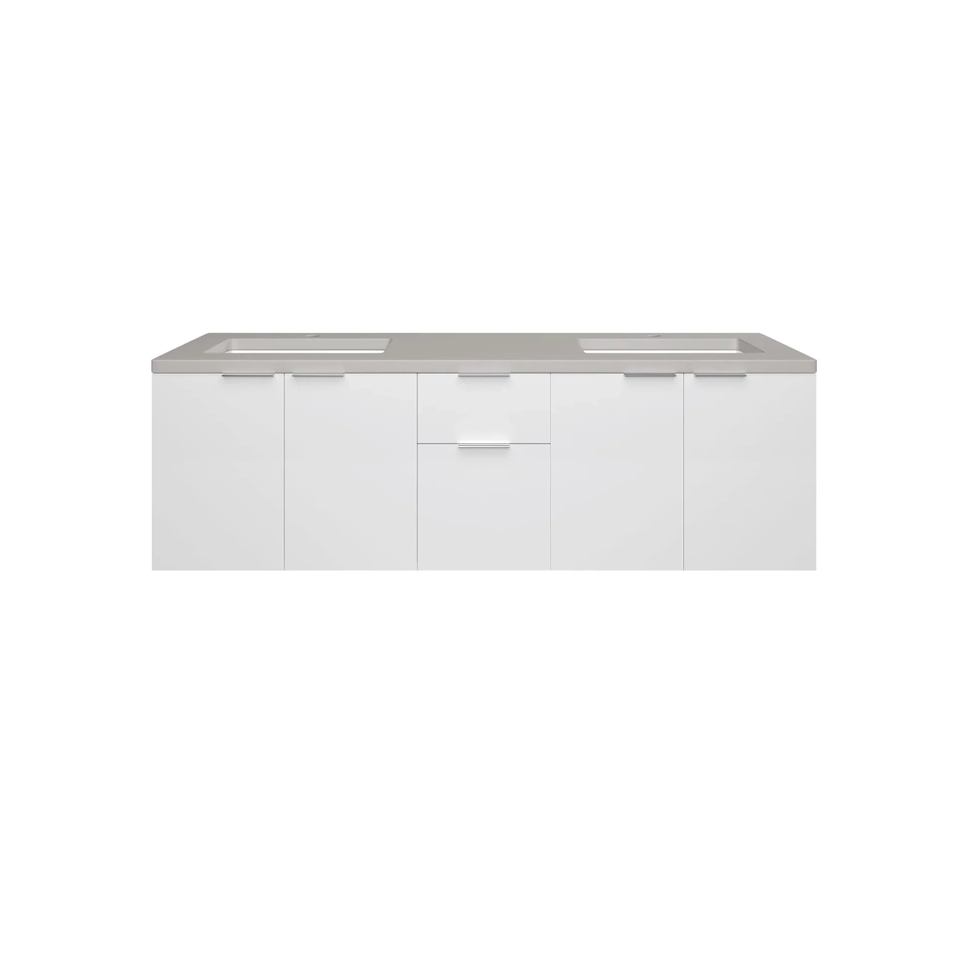 Brenlyn single vanity has a crisp modern look in glossy white with a brushed nickel base complimented by sophisticated tab pulls. The subtle contrast of the pietra gray quartz top with ceramic undermount sink adds rich detail. The versatile design allows for your choice of hanging the vanity on the wall for a trendy minimalist look or to use the shelf and base, included for a more traditional floor mount that also serves as extra storage. The vanity features one-soft close door, two-drawers with a faux top third drawer. An integrated dual electric and USB outlet.