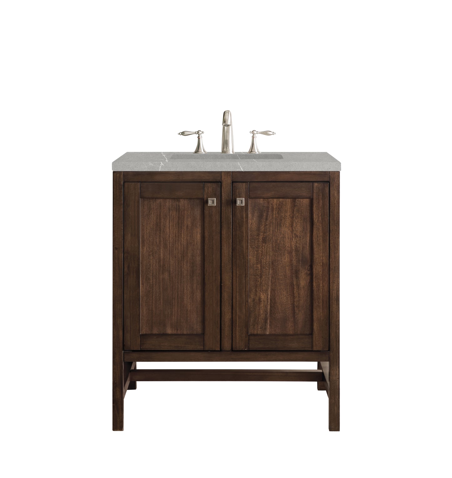 The Addison Collection 30-in. Free-standing Vanity by James Martin Vanities comes in a mid-century finish on parawood with a quartz top giving you a fresh take on Shaker-inspired design with a look of luxury. Handcrafted and gender-neutral, it fits effortlessly into modern or transitional rooms. This versatile vanity shows off its elegant style with a rectangular basin of white ceramic. The Shaker touch comes from the sides and doors. The body of the cabinet is made of solid hardwood and sturdy panels of MDF. The countertop is pre-drilled for a three-hole faucet with an eight-inch widespread. Adding a cool contrast to the rich wood with burnished nickel hardware, The Eternal Serena top has the new N-boost technology as well which helps prevent the adhesion of liquids, enhances shine, and intensifies the color of this top.