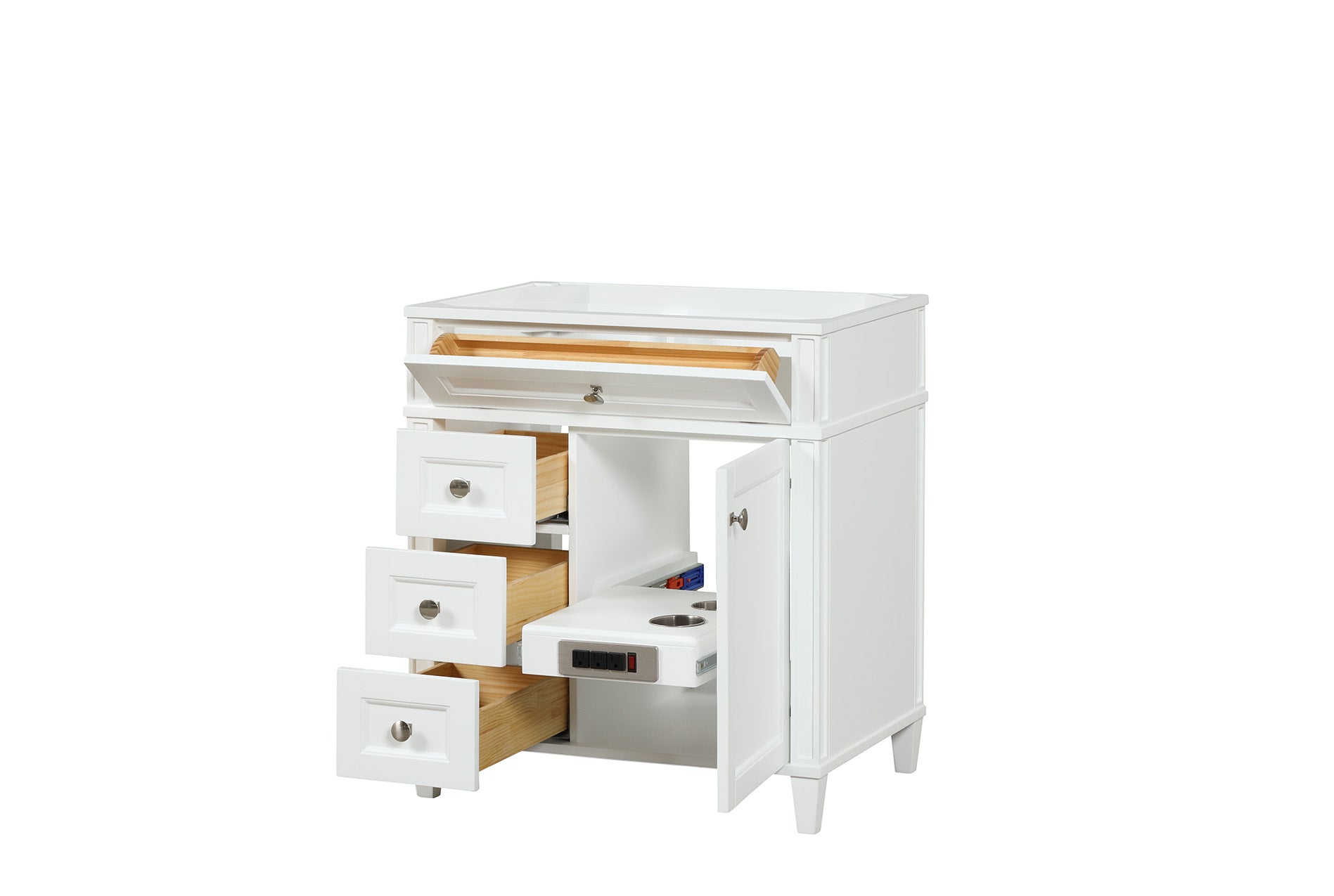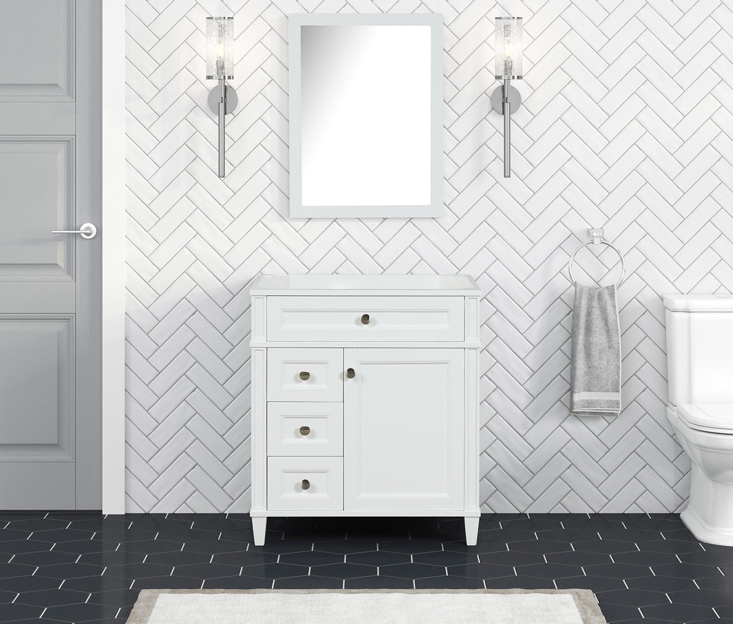 This transitional cabinet is crafted with beautiful details, from the tapered legs to the hand-carved pilasters. With a blend of both Traditional and Transitional styles, the charm of the Kensington Collection is fitting for a variety of interior designs. Setting a crisp and serene environment, the Kensington Collection is available in 2 of our best finish colors- bright white and metal gray. With satin nickel hardware, the style of this vanity is designed for modern living. Accentuate your bathroom with an updated and classic look using the Kensington Collection!